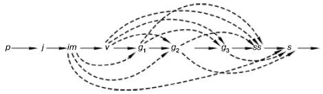 Варианты развития ежи сборной в разных экологических условиях (по Л. А. Жуковой, 1985). Латинскими буквами обозначены возрастные состояния растений, а пунктирными линиями – их возможная последовательность