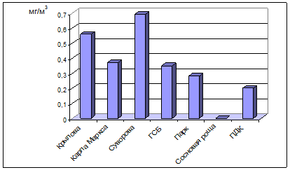 Как можно видеть из рисунка 1, высокая концентрация пыли в воздушной среде города была обнаружена на всех исследуемых улицах, кроме Сосновой рощи. На улице Суворова содержание исследуемого загрязнителя было наибольшим и составило 0,69 мкг/м3. На улице Крылова содержание пыли составило 0,56 мкг/м3. Для улиц Карла Маркса и Героев Сталинградской битвы показатели по данному загрязнителю имели примерно одинаковые средние значения и составили 0,37 и 0,35 мкг/м3 соответственно. Достаточно низкие показатели по концентрации пыли были получены в Парке культуры и отдыха XXX-летия ВЛКСМ и составляли 0,28 мкг/м3.