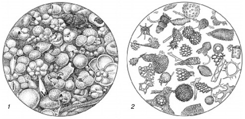 Органогенные илы дна океана (но С. А. Зернову, 1949): 1 – глобигерииоиый и 2 – радиоляриевый илы из Индийского океана; 3 – диатомовый ил с места вблизи края антарктического льда