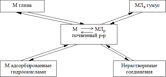 На рисунке Лр – растворимые лиганды, какими являются органические кислоты с малым молекулярным весом, а Лн – нерастворимые. Реакция металлов (М) с гумусовыми веществами включает частично и ионный обмен.