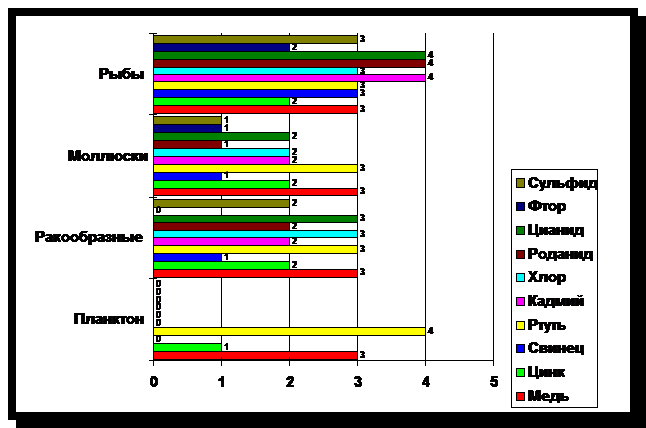 Основными неорганическими (минеральными) загрязнителями пресных и морских вод являются разнообразные химические соединения, токсичные для обитателей водной среды. Это соединения мышьяка, свинца, кадмия, ртути, хрома, меди, фтора. Большинство из них попадает в воду в результате человеческой деятельности. Тяжелые металлы поглощаются фитопланктоном, а затем передаются по пищевой цепи более высокоорганизованным организмам. Токсический эффект некоторых наиболее распространенных загрязнителей гидросферы представлен на рисунке 2: